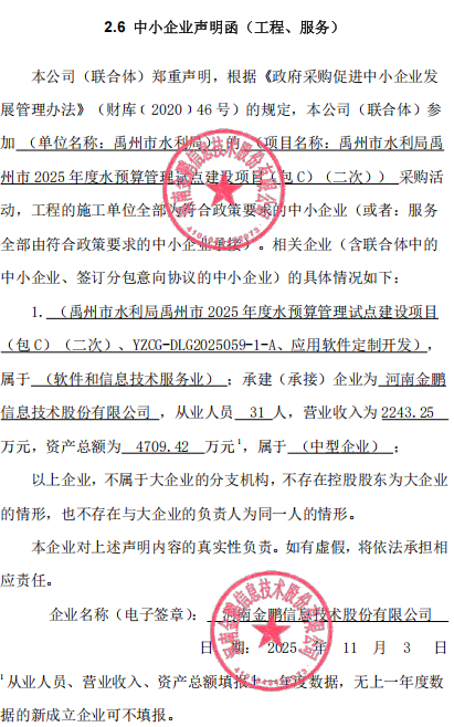 | 1.项目概况:禹州市已被纳入水预算管理试点,其实施区域覆盖了整个市域,包括26个乡镇(办)。2025年取水口安装计量监测设施单位共312家332处(其中,新建160家180处,更换152家152处)。 2.采购内容:应用软件定制开发,建成禹州市水预算智慧管理平台,与现有其他水利业务系统的数据同源共享,实现水预算“告知-申报-核算-下达-监督执行-交易-决算”等全流程信息化管理,提升水预算管理能力。(见本项目招标文件第二章“项目需求”) 3.项目地点:禹州市 4.合同履行期限:见招标文件。 | |||||||||||||||||||||||||||||||