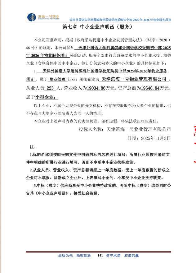 ************学校采购初中部2025年-2026年物业服务项目实施采购,现将中标结果公布如下: 一、项目名称和编号 1.******学校采购初中部2025年-2026年物业服务项目 2.项目编号:TJBH-2025-D-0170 二、中标信息 1.******有限公司 2.******居住区嘉泰路140号 3.供应商评审报价、评审总得分及排序情况:见附件 4.主要中标标的名称、规格型号、数量、单价、服务要求或者标的基本概况:物业管理服务 ******委员会成员名单 朱禧、单战、张健文、马畅、郭晓旭(采购人代表) 四、项目联系人及联系方式 1.联系人:肖琳 2.联系方式:022-****** 五、采购人的名称、地址和联系方式 1.******学校 2.采购人地址:天津市滨海新区中新天津生态城和韵路1799号 3.采购人联系电话:张咪咪,022-****** 六、采购代理机构的名称、地址和联系方式 1.采购代理机构名称:天津市滨海新区政府采购中心 2.采购代理机构地址:天津市滨海新区营口道468号 3.采购代理机构联系方式:022-****** 七、质疑方式 参与本项目政府采购活动的供应商认为中标结果使自己的合法权益受到损害的,可以在中标结果公告期限届满之日起7个工作日内,以书面形式向采购人和天津市滨海新区政府采购中心提出质疑,逾期不予受理。 八、本项目不向中标供应商收取服务费。 九、中标结果公告期限 中标结果的公告期限为1个工作日。 十、招标文件公告:见附件