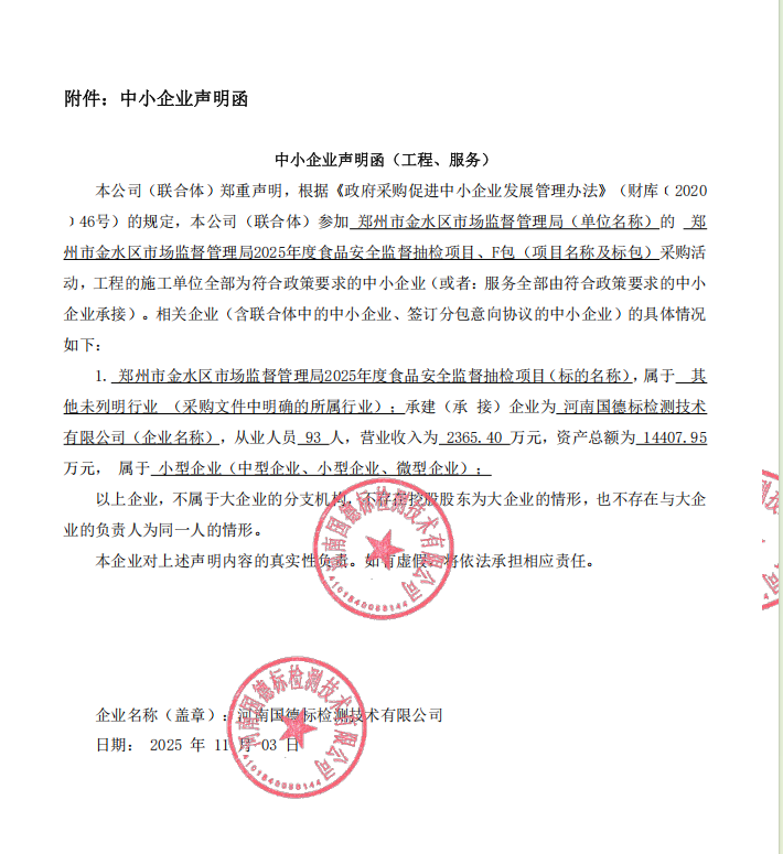 | ******管理局2025年度食品安全监督抽检项目是对本辖区内生产、流通、餐饮环节中的食品和食用农产品等进行食品抽样检测服务; ******管理局2025年度食品安全监督抽检项目是对本辖区内生产、流通、餐饮环节中的食品和食用农产品等进行食品抽样检测服务(具体详见清单); 3、服务地点:郑州市金水区辖区内; 4、服务要求:达到国家规范合格标准,满足采购人要求; 5、服务期限:自签订合同之日起一年; | |||||||||||||||||||||||||||||||