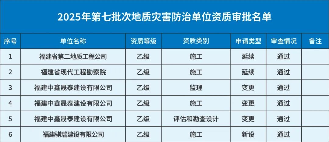 根据《地质灾害防治条例》(国务院令第394号)、《地质灾害防治单位资质管理办法》(自然资源部令第8号)、《自然资源部关于〈地质灾害防治单位资质管理办法〉有关事项的公告》(2022年第97号)、《自然资源部办公厅关于贯彻落实〈地质灾害防治单位资质管理办法〉的通知》(自然资办函〔2022〕2512号)和《福建省自然资源厅关于做好地质灾害防治单位资质审批工作的通知》(闽自然资发〔2022〕82号)等有关规定,我厅组织开展2025年第七批地质灾害防治单位资质申请受理审查工作。经审查并公示,共对4个地质灾害防治单位提交的6个乙级资质申请予以通过,现予公告。
